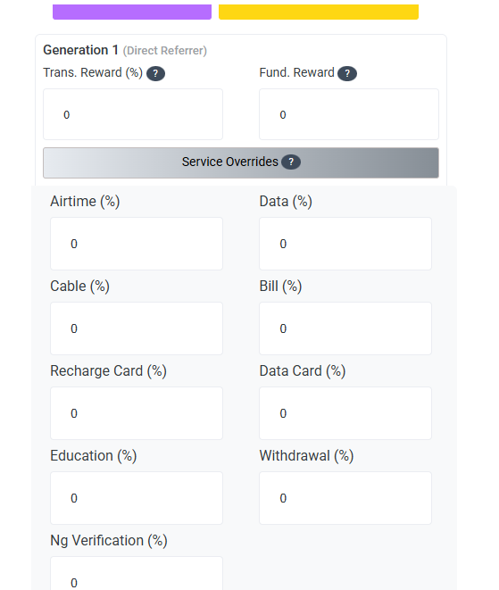 Trans Rewards %: Default bonus given to upline generation x (can be overriten by the service override